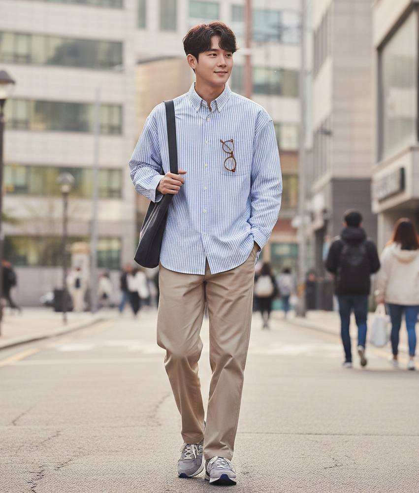 화이트 셔츠 + 베이지 치노 + 그레이 스니커즈